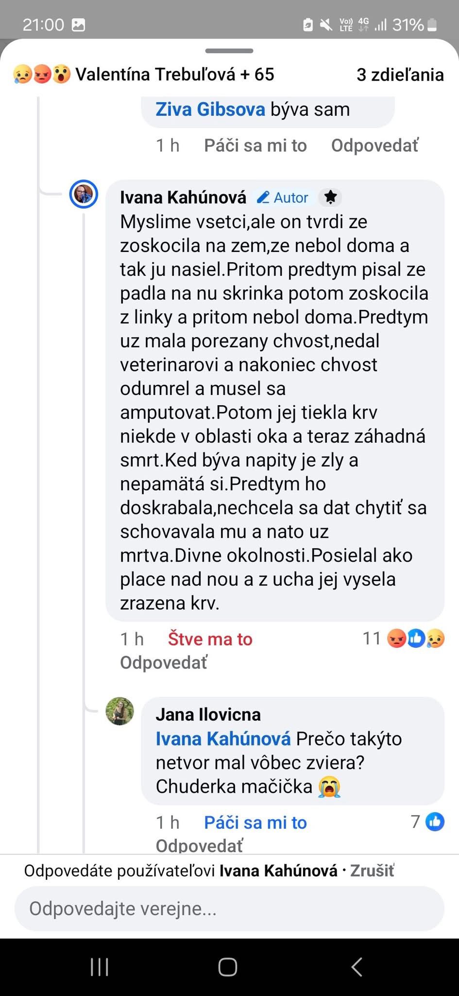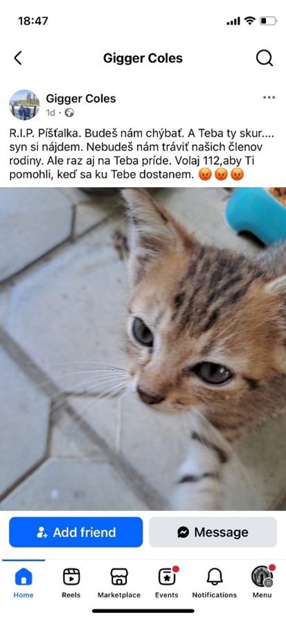 Dnes som našiel svojho kocúra mŕtveho. Otraveneho. A ďalšieho neviem nájsť. Je mi Ťa ľúto. Si chorý. Ale ja si Ťa nájdem. A Boh Ťa varuj ahoj. Ja viem kto si. Len Ti to neviem dokázať. Ale budem Ti klopať na bránu. Ale spolu so 112.